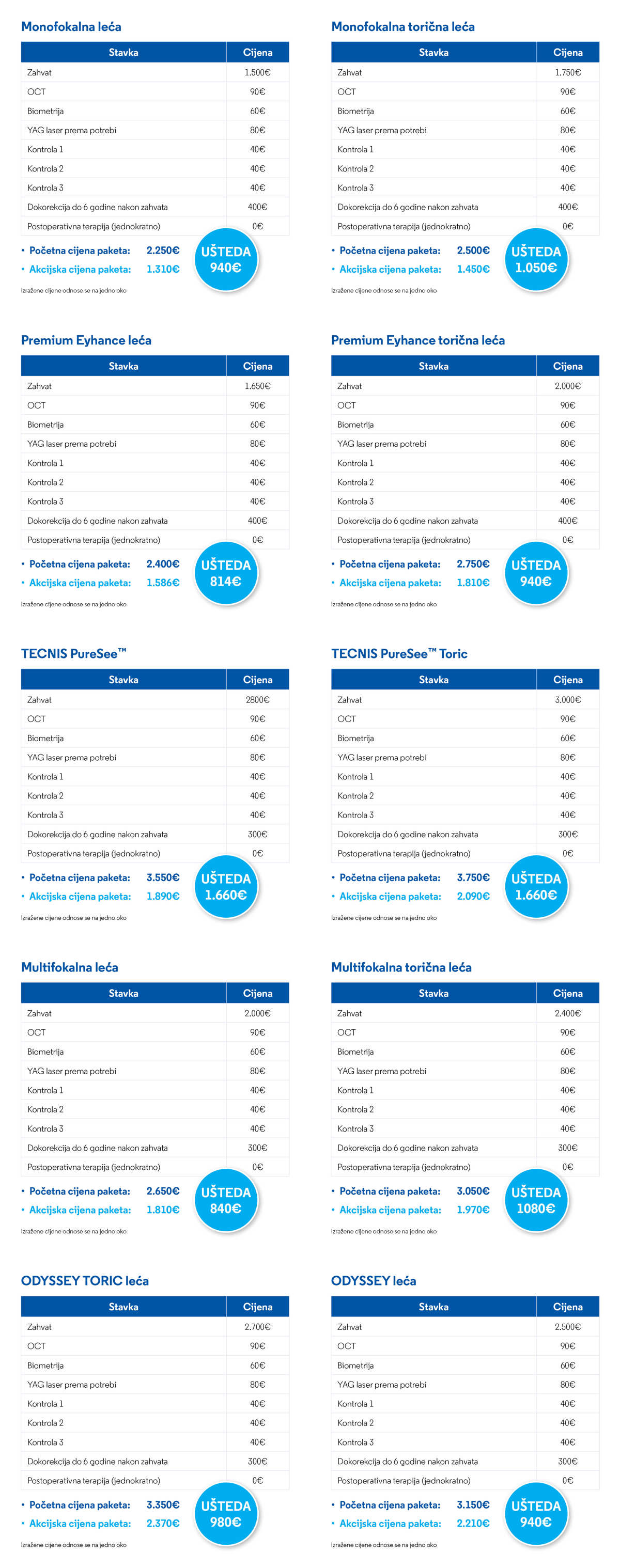 Sve navedene cijene odnose se na jedno oko.